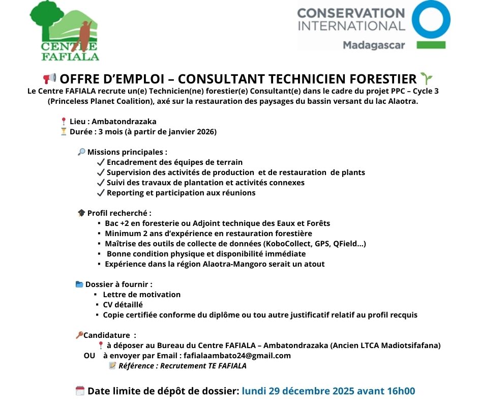 Le Centre FAFIALA recrute un(e) Technicien(ne) forestier(e) Consultant(e) dans le cadre du projet PPC – Cycle 3 (Princeless Planet Coalition), axé sur la restauration des paysages du bassin versant du lac Alaotra.