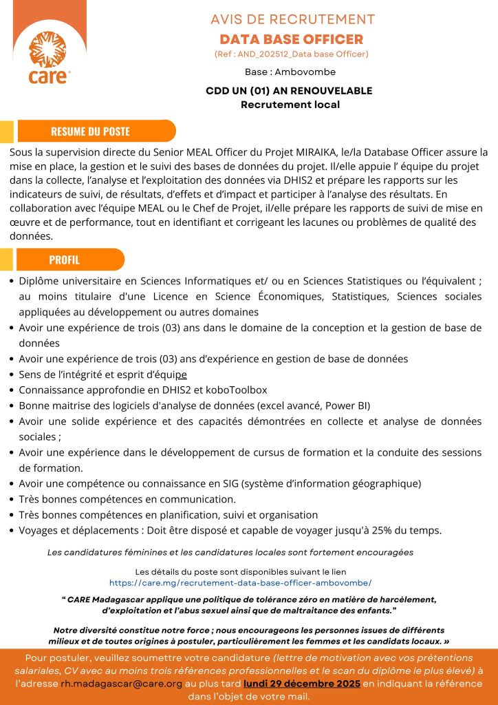 Le projet MIRAIKA de CARE Madagascar renforce son équipe et lance le recrutement de nouveaux collaborateurs :
