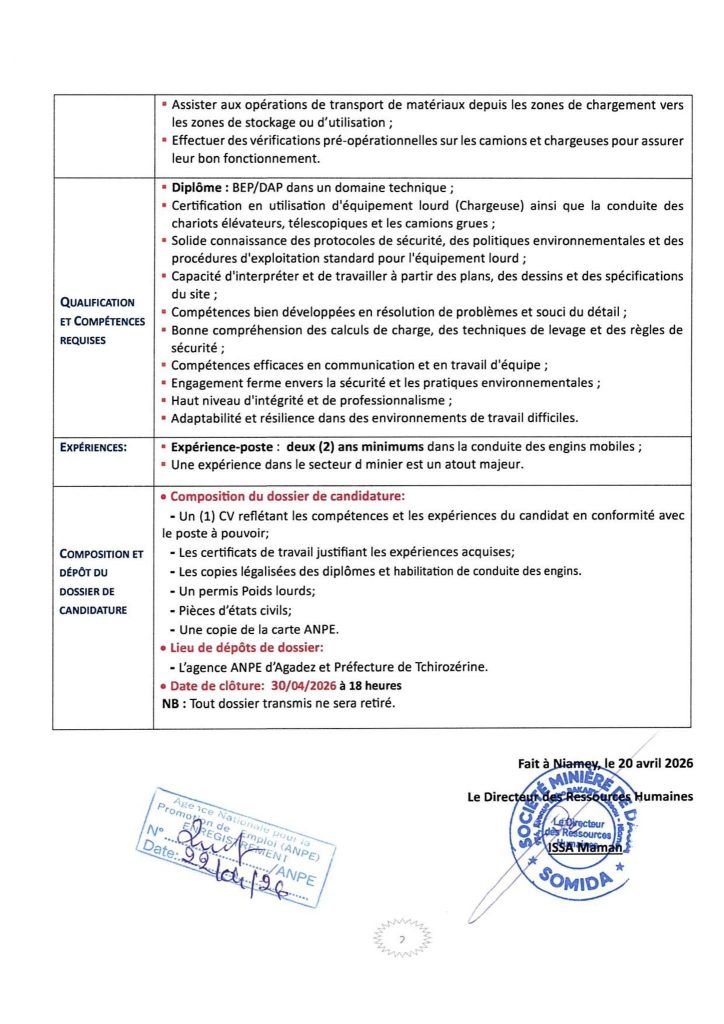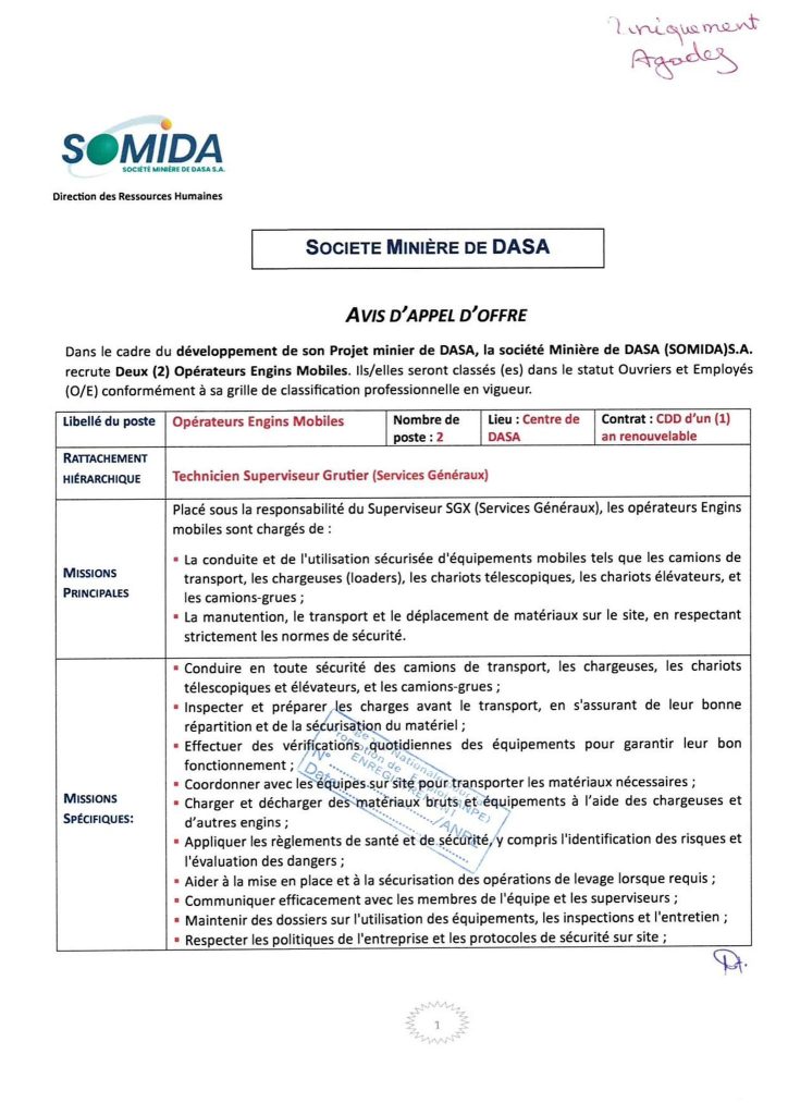 SOMIDA S.A. Recrute Deux (2) Opérateurs Engins Mobiles