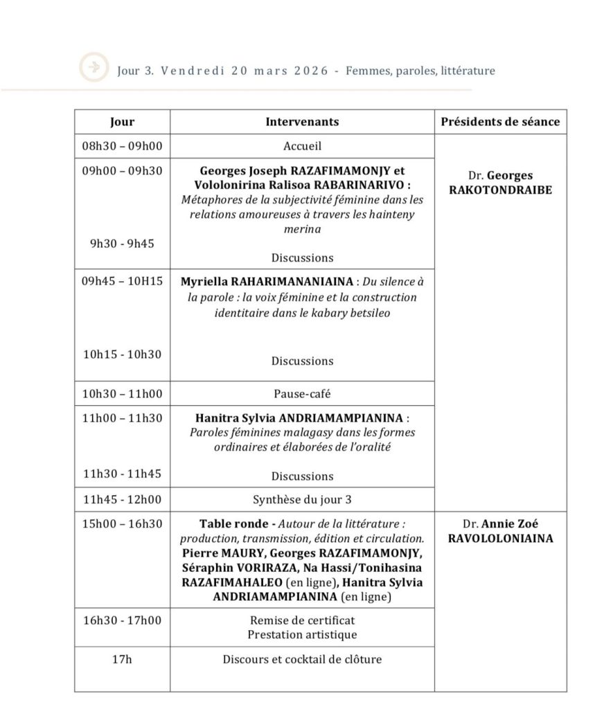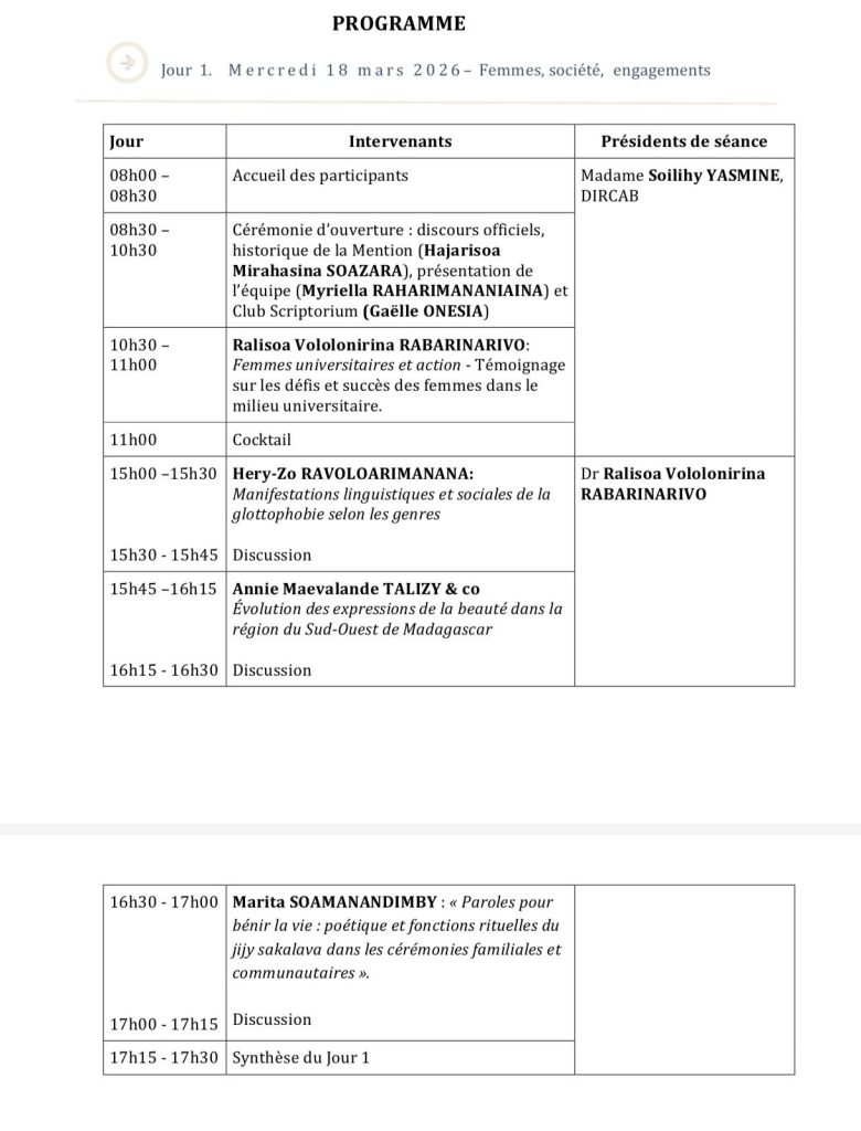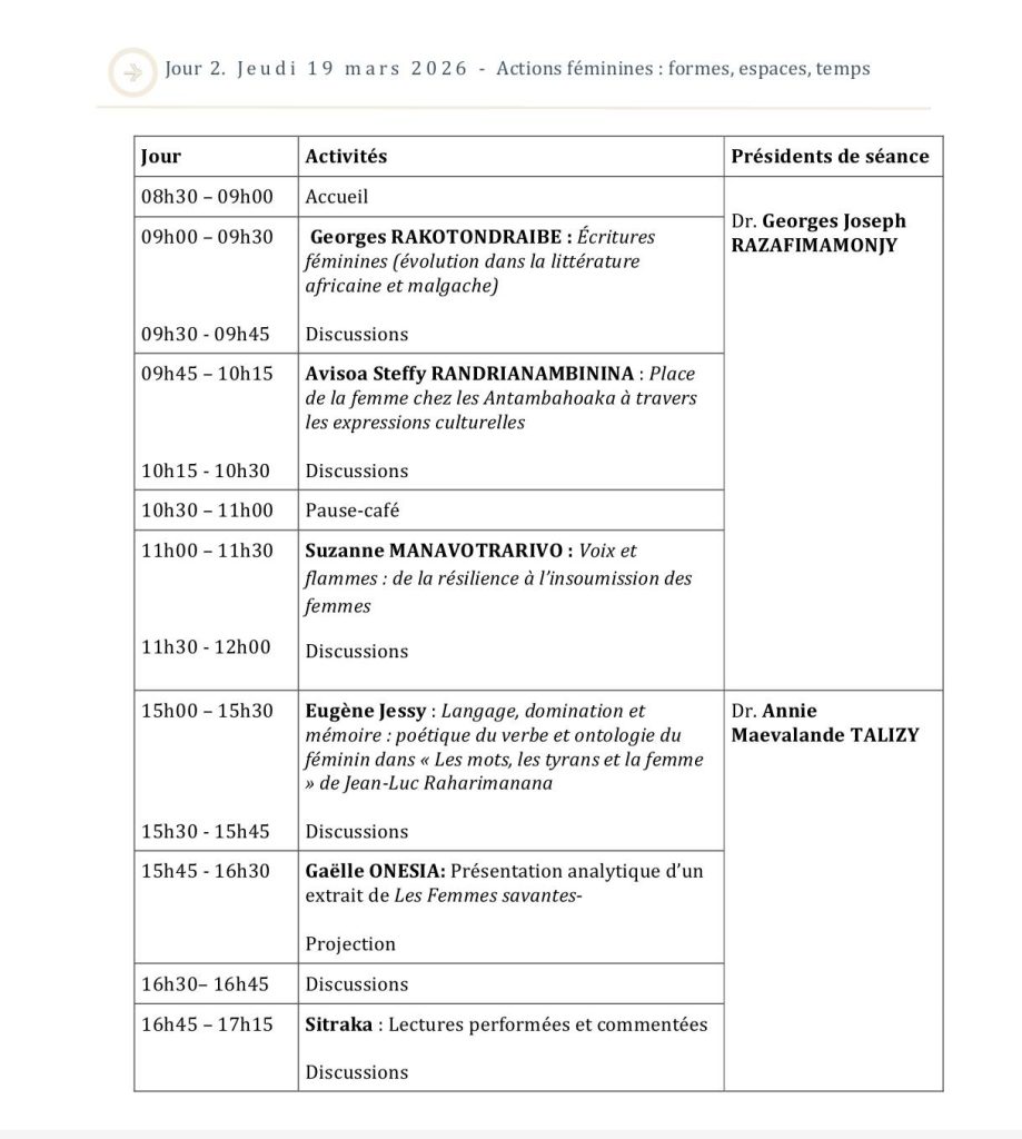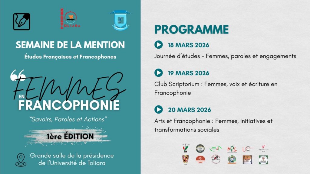 Du 18 au 20 mars 2026, la Mention Études Françaises et Francophones de l’Université de Toliara organise la 1ère édition de “𝑭𝒆𝒎𝒎𝒆𝒔 𝒆𝒏 𝑭𝒓𝒂𝒏𝒄𝒐𝒑𝒉𝒐𝒏𝒊𝒆”.