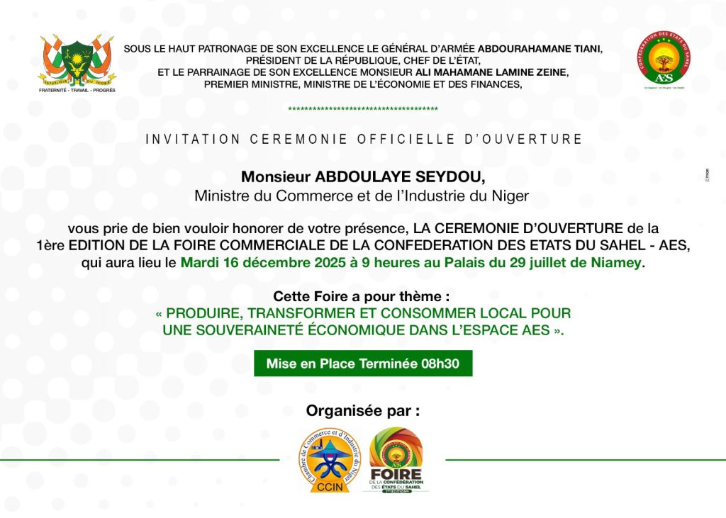 L’AES se donne rendez-vous du *16 au 20 décembre 2025 au Palais du 29 Juillet* de Niamey pour *LA première Edition de la FOIRE DE CONFEDERATION DES ÉTATS DU SAHEL*