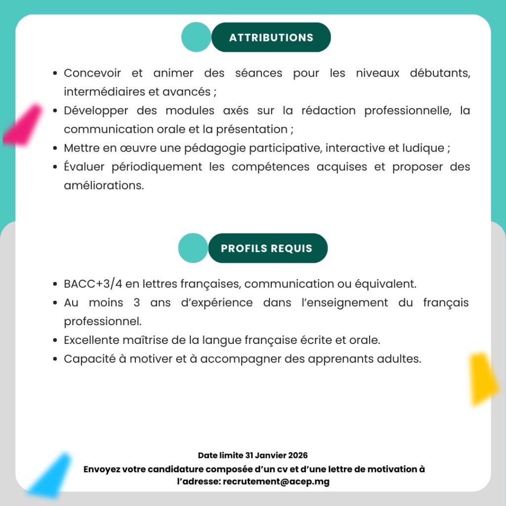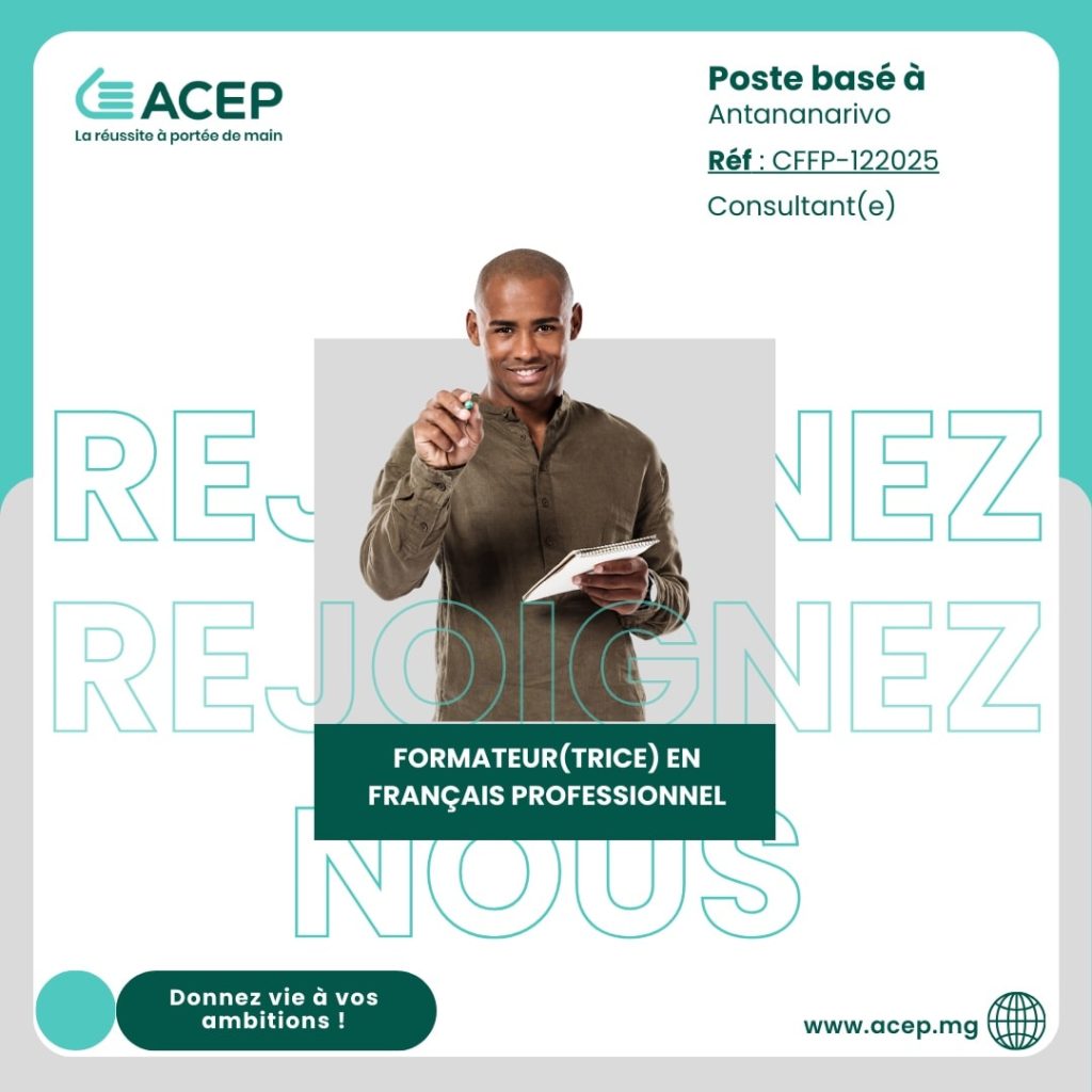 Raha mahaliana anao ito tolotr’asa ito dia manasa anao handefa CV amin’ny adiresy mailaka recrutement@acep.mg, na koa manatona mivantana ny ACEP Madagascar Faravohitra.
