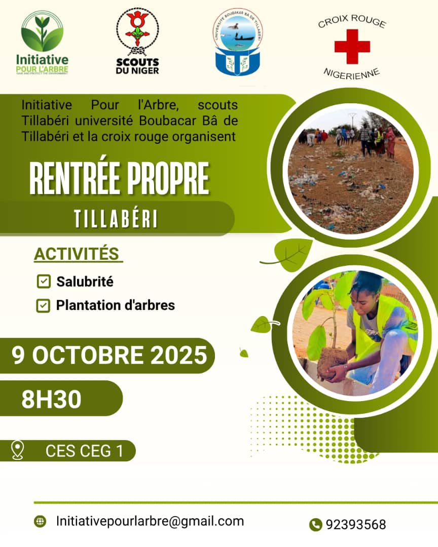 La communauté d’impact de l Initiative Pour l’Arbre de Tillaberi, en collaboration avec l Université Boubakar Bâ de Tillabéri, le Mouvement Scout et la Croix-Rouge, organise une grande action citoyenne au CES 1 de Tillabéri ce jeudi 9 octobre 2025.