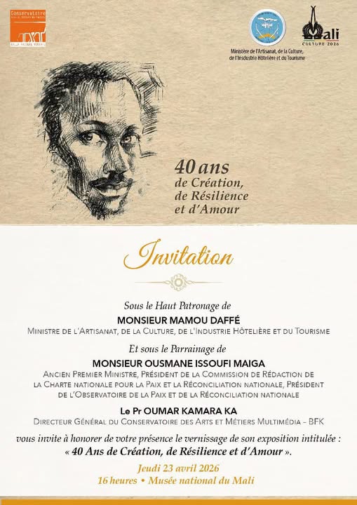 Sous le Haut Patronage du Ministre de l’Artisanat, de la Culture, de l’Industrie hôtelière et du Tourisme, M. Mamou DAFFÉ, et sous le Parrainage de M. Ousmane Issoufi MAÏGA, ancien Premier ministre, le Professeur Oumar KAMARA KA, artiste peintre et Directeur Général du Conservatoire des Arts et Métiers Multimédia Balla Fasséké Kouyaté, vous invite à honorer de votre présence le vernissage de son exposition intitulée : « 𝟒𝟎 𝐚𝐧𝐬 𝐝𝐞 𝐂𝐫𝐞́𝐚𝐭𝐢𝐨𝐧, 𝐝𝐞 𝐑𝐞́𝐬𝐢𝐥𝐢𝐞𝐧𝐜𝐞 𝐞𝐭 𝐝’𝐀𝐦𝐨𝐮𝐫 ».