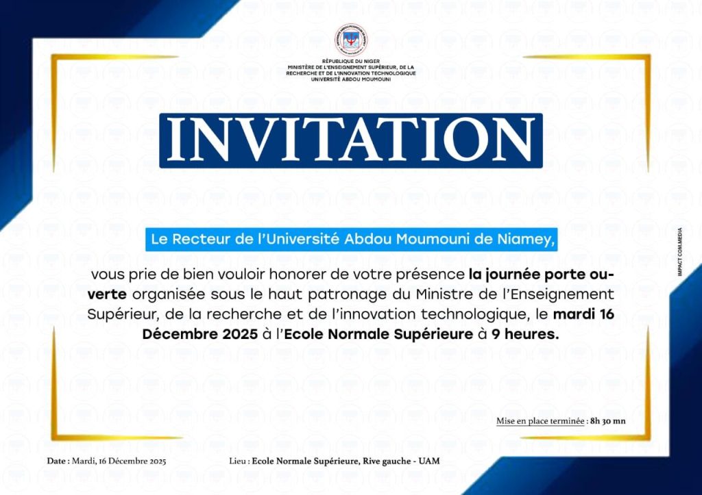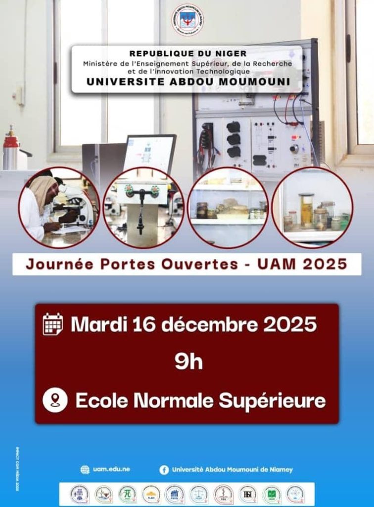Sous le haut patronage du Ministre de l’Enseignement Supérieur, de la Recherche et de l’Innovation Technologique, le Professeur MAMADOU Saidou, et sous la présidence du Recteur de l’Université Abdou Moumouni, le Professeur BARAGÉ Moussa, l’Université Abdou Moumouni de Niamey organise la 1re Édition de la Journée Porte Ouverte, UAM 2025 !