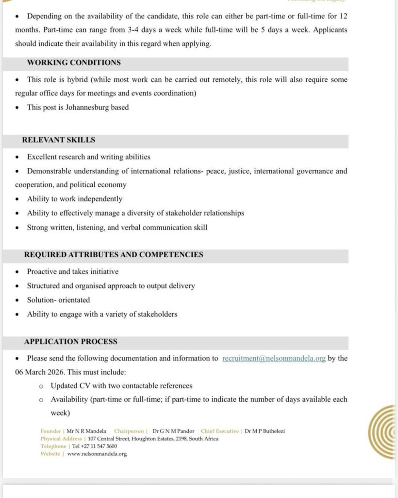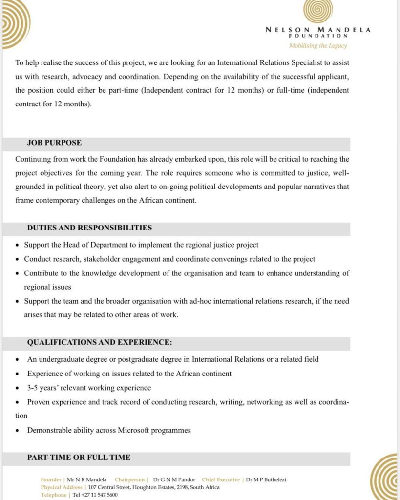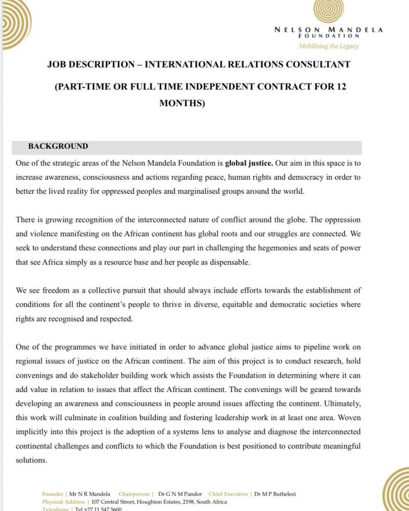 #InternationalRelations#Consultancy#AfricaJobs#HumanRights#GlobalJustice#PolicyCareers#DevelopmentJobs#ResearchJobs#Governance#NelsonMandelaFoundation ·