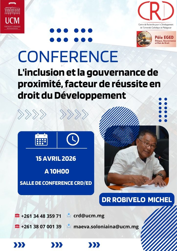 Le Centre de Recherche pour le Développement (CRD) de l’Université Catholique de Madagascar (UCM) a le plaisir de vous convier à une conférence autour du thème :