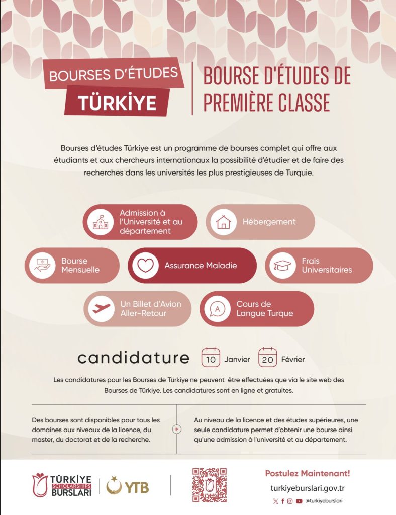 En ce 10 janvier 2026, la nouvelle campagne de candidature à la Bourse du Gouvernement turc est officiellement lancée jusqu’au 20 février prochain. Ne perdez plus le temps, soumettez dès maintenant votre candidature.