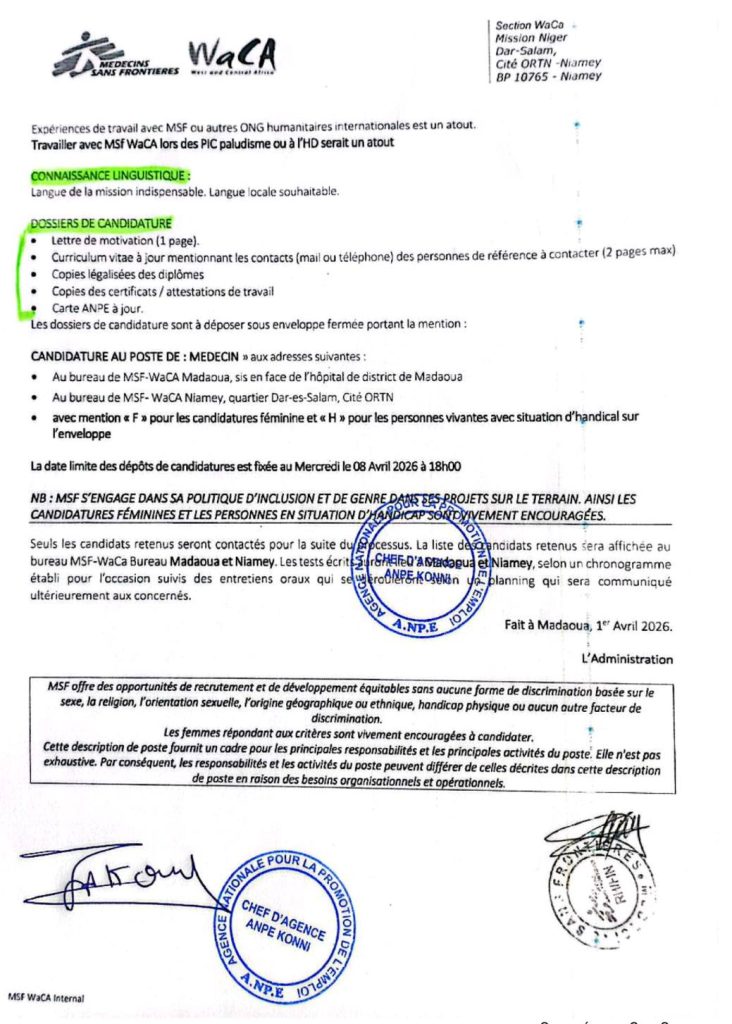 Date limite des dépôts de candidatures: Mercredi 8 Avril 2026 à 18H00.