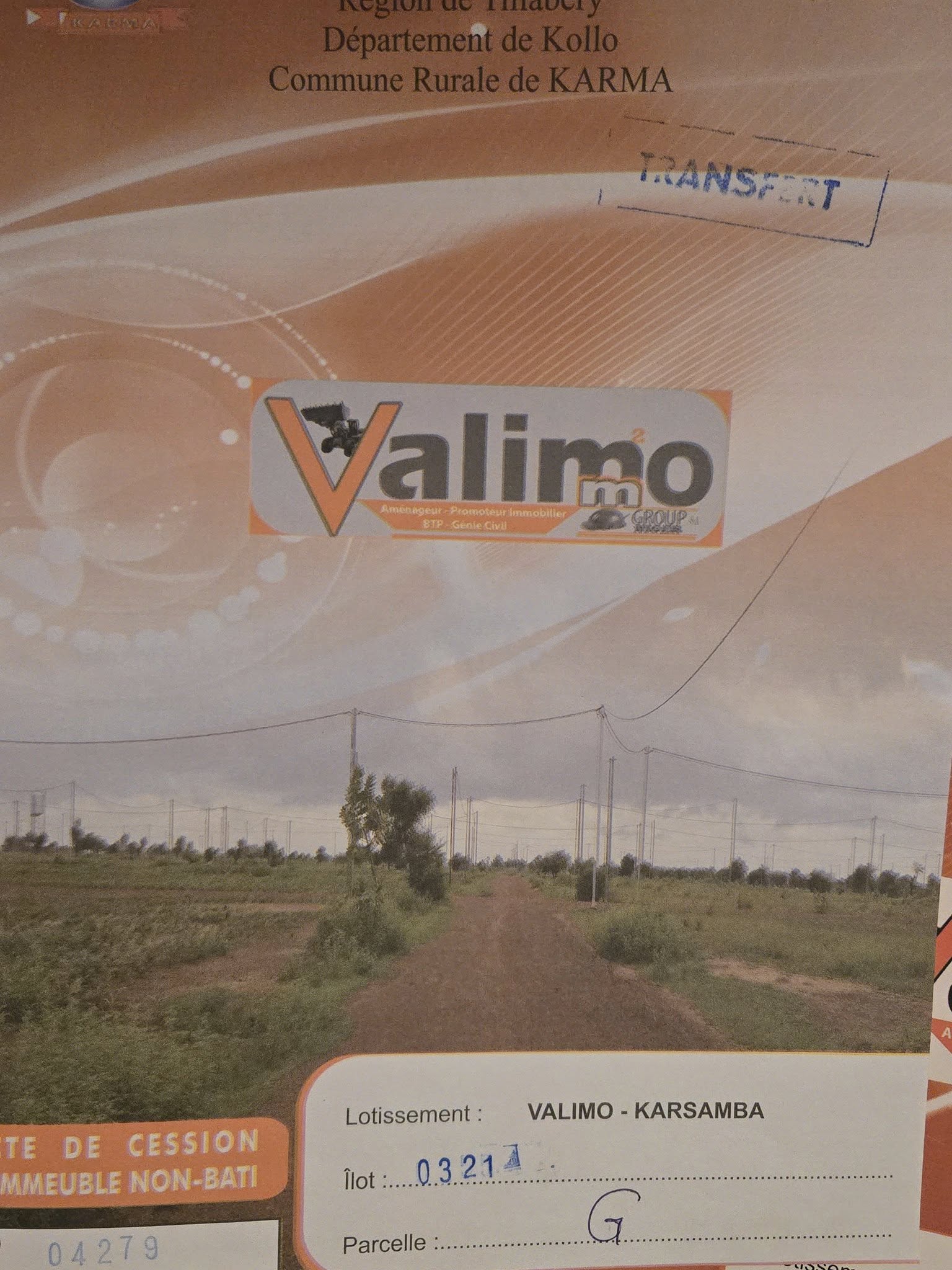 Je met en vente un Terrain urbain non bâti d’une superficie de Quatre Cents (400m2) mètres carrés sis à Karma dans la zone d’habitat traditionnel du lotissement -(VALIMO KARSAMBA), formant la parcelle ( G ) – d’îlot (0321), Objet de l’acte de cession N°….