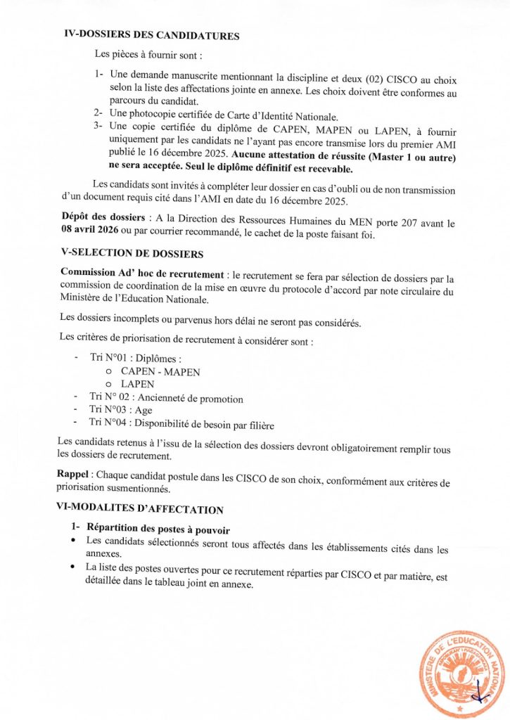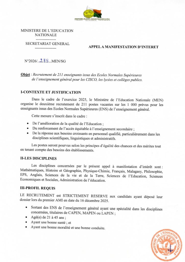 RECRUTEMENT DE 211 POSTES VACANTS SUR LES 1.000 PRÉVUS POUR LES ENSEIGNANTS ISSUS DES ÉCOLES NORMALES SUPÉRIEURES (ENS)