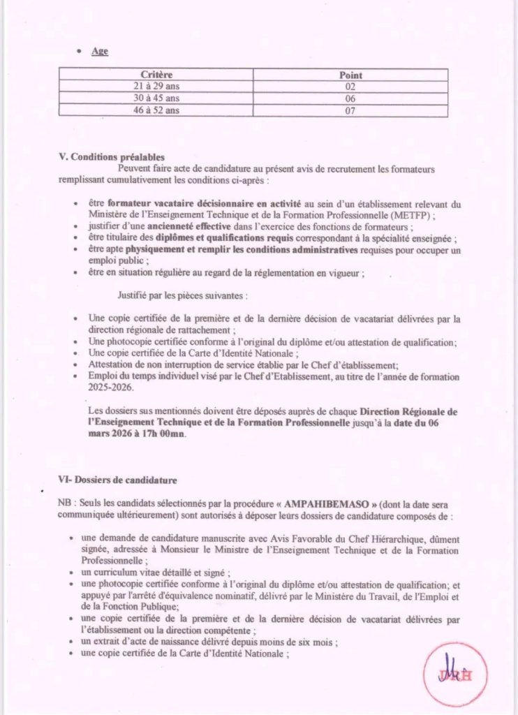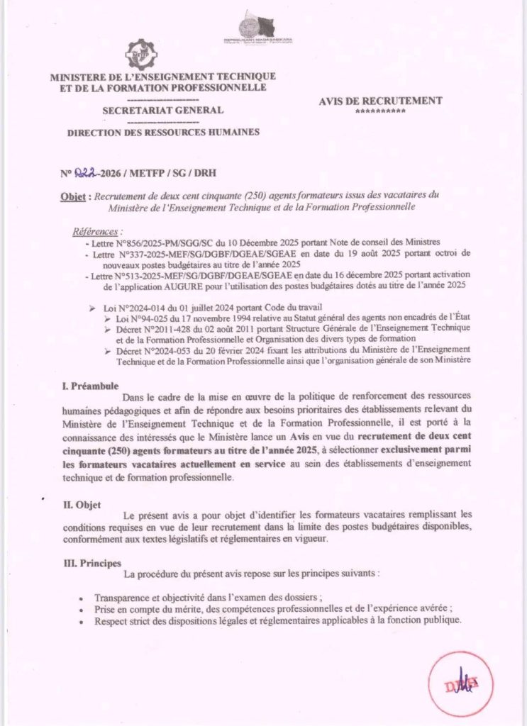 Recrutement de formateurs “vacants” (250) sous le ministère de l’Enseignement Technique et de la Formation Professionnelle.