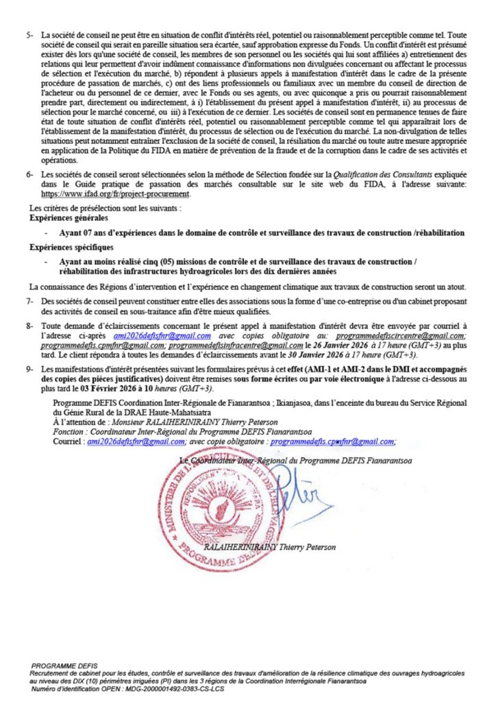 Appel à manifestation d’intérêt – Sociétés de conseil : « recrutement de cabinet pour le contrôle et la surveillance des travaux de réhabilitation du PI »