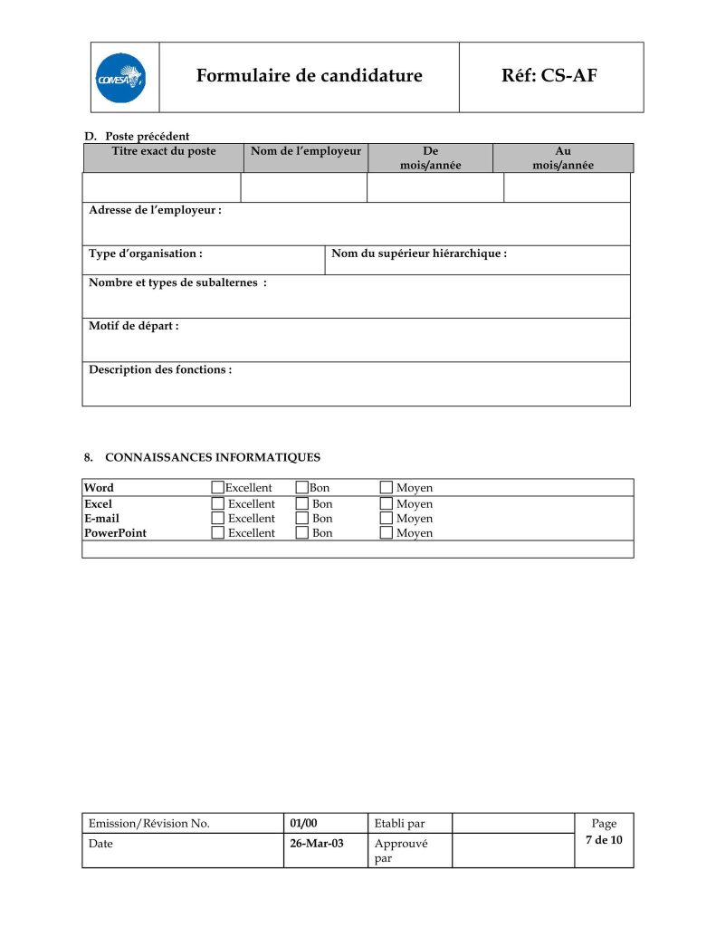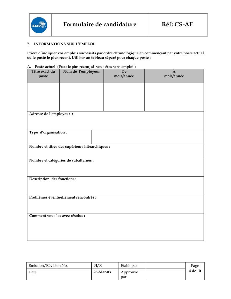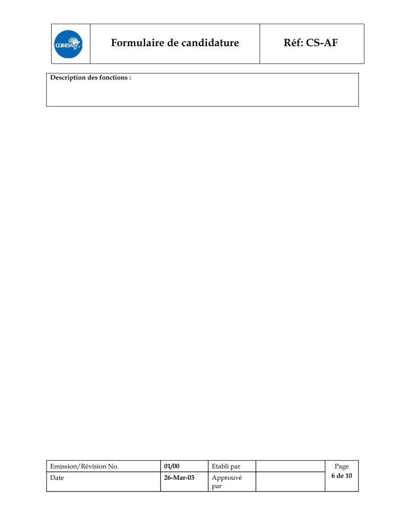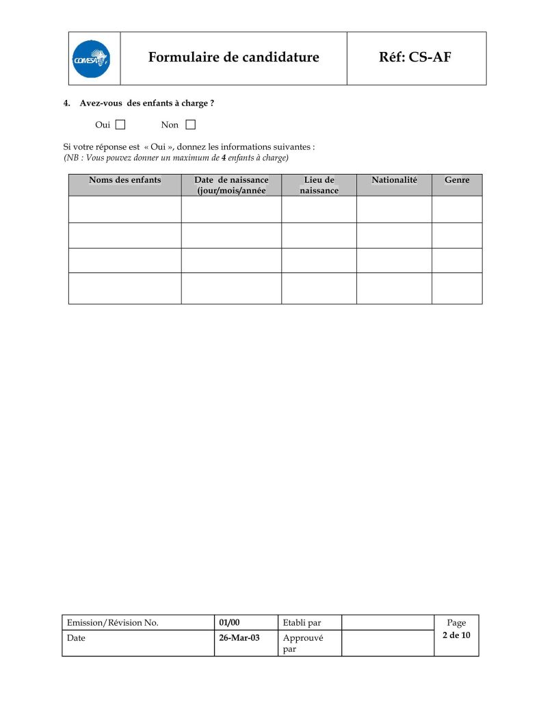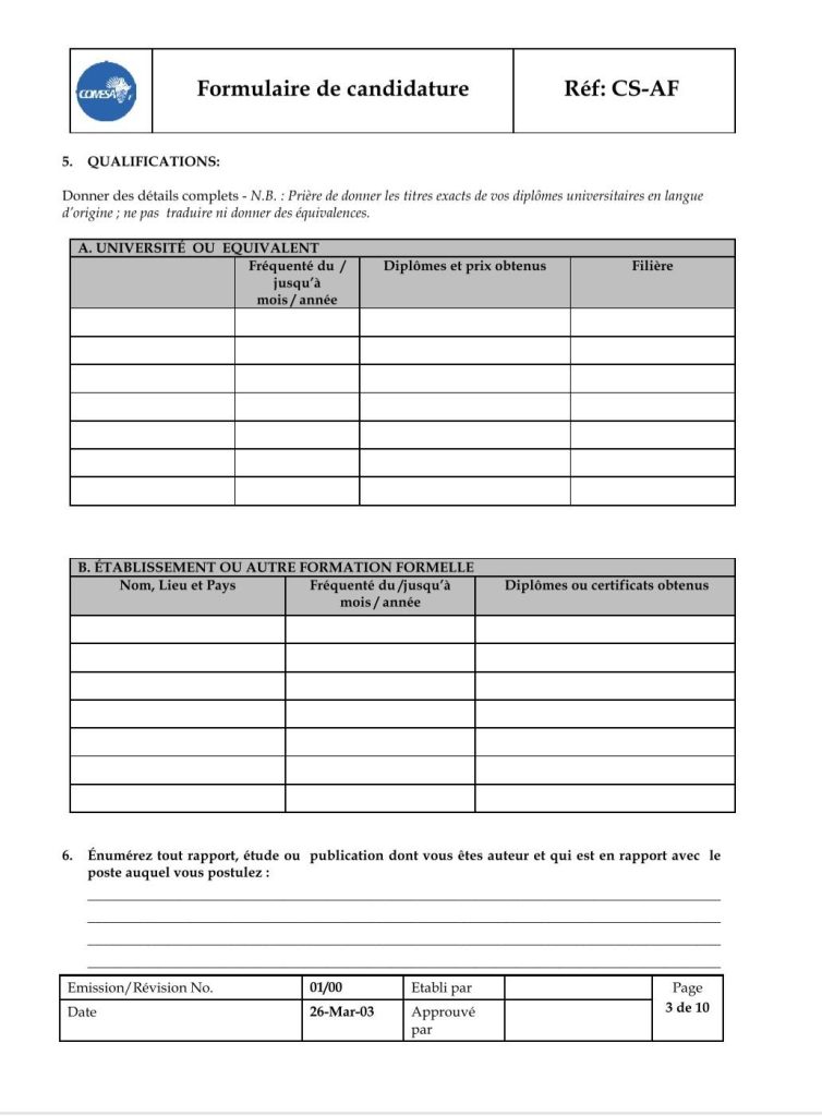 – le formulaire de candidature dûment rempli, téléchargeable sur l’adresse https://www.comesa.int/comesa-job-application-format ;