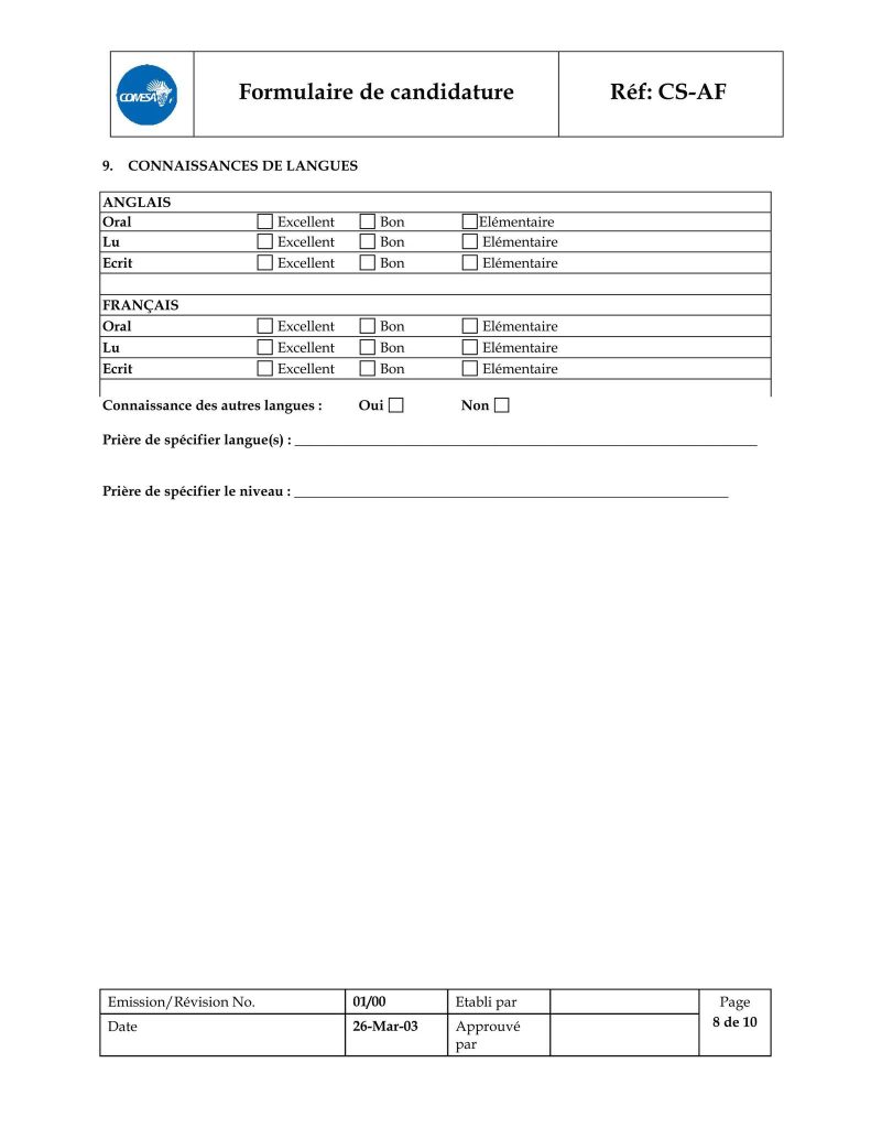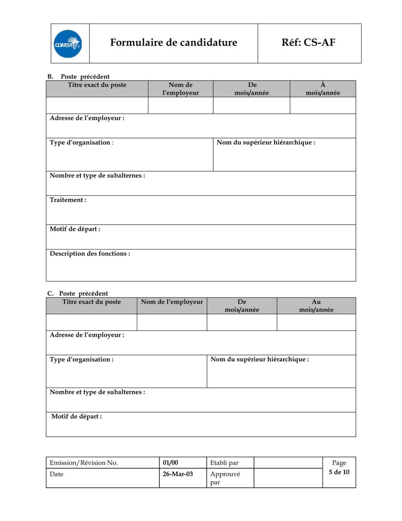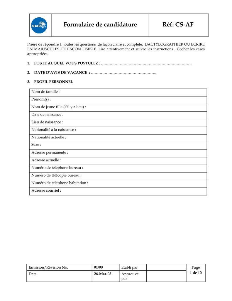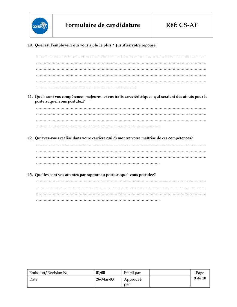 – le formulaire de candidature dûment rempli, téléchargeable sur l’adresse https://www.comesa.int/comesa-job-application-format ;