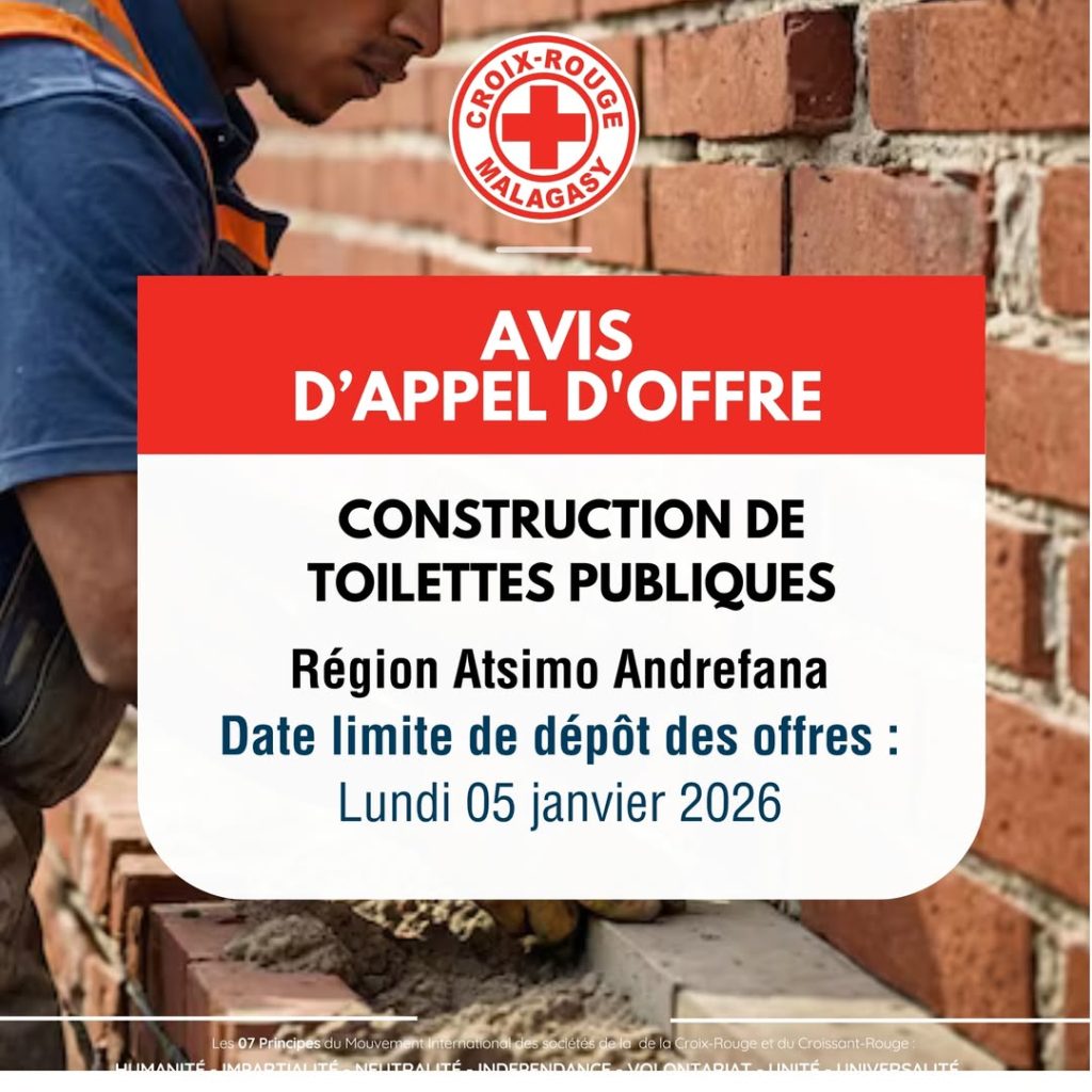 La Croix-Rouge Malagasy (CRM) relance son appel d’offres pour la construction de toilettes publiques au niveau des fokontany cibles de Toliara, Région Atsimo Andrefana.