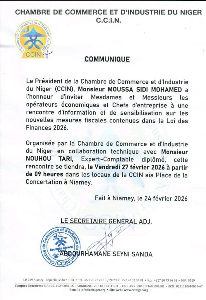La Chambre de Commerce et d’Industrie du Niger informe les #opérateurs#économiques de la tenue d’une rencontre d’information sur les nouvelles mesures #fiscales de la #Loi des #Finances #2026.
