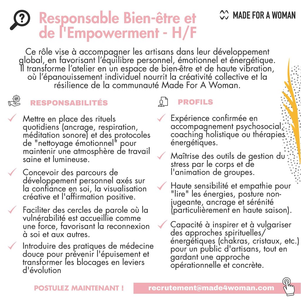 Envoyez votre candidature à : recrutement@made4woman.com