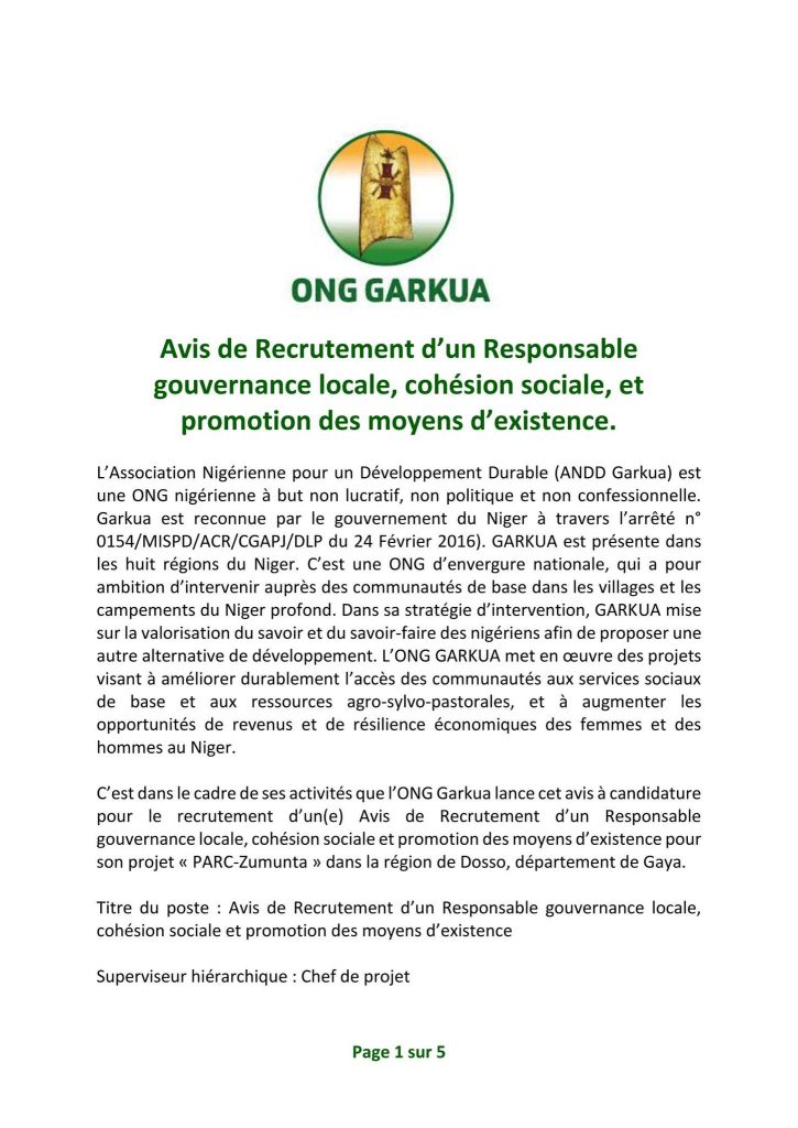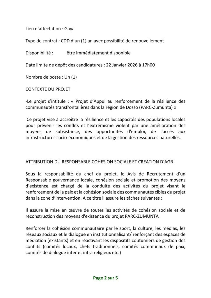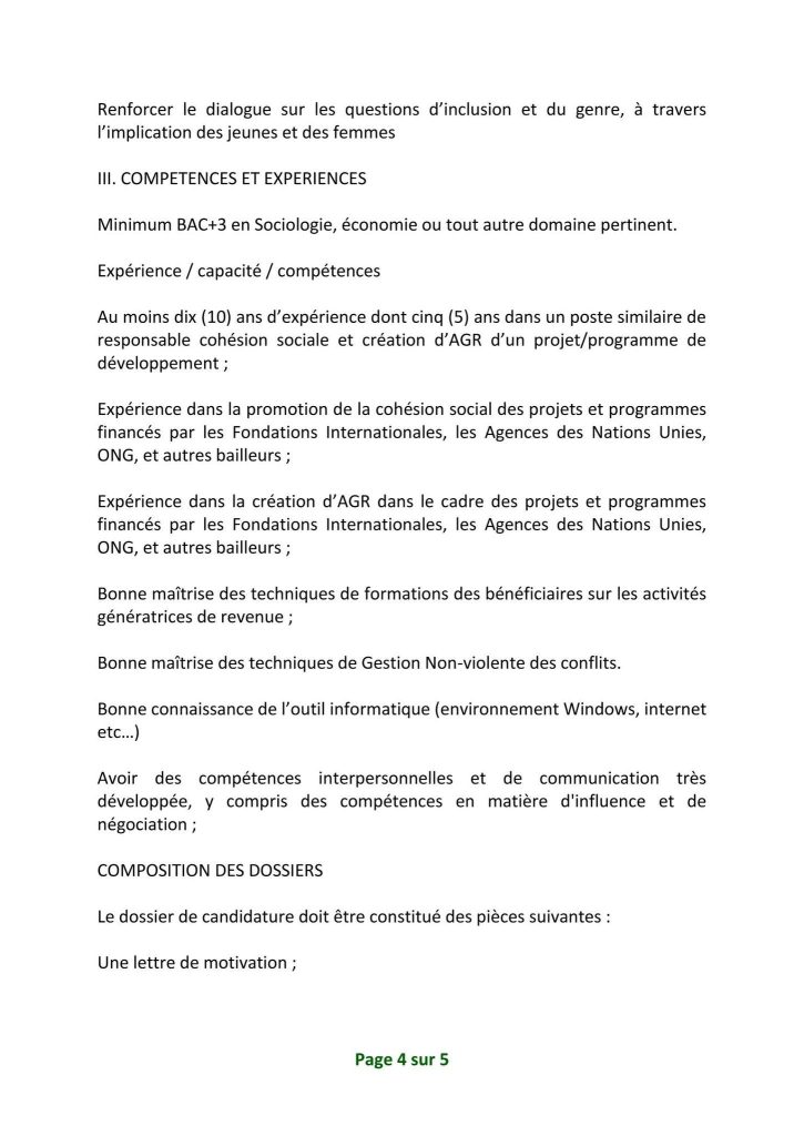 Titre du poste: Avis de Recrutement d’un Responsable gouvernance locale, cohésion sociale et promotion des moyens d’existence