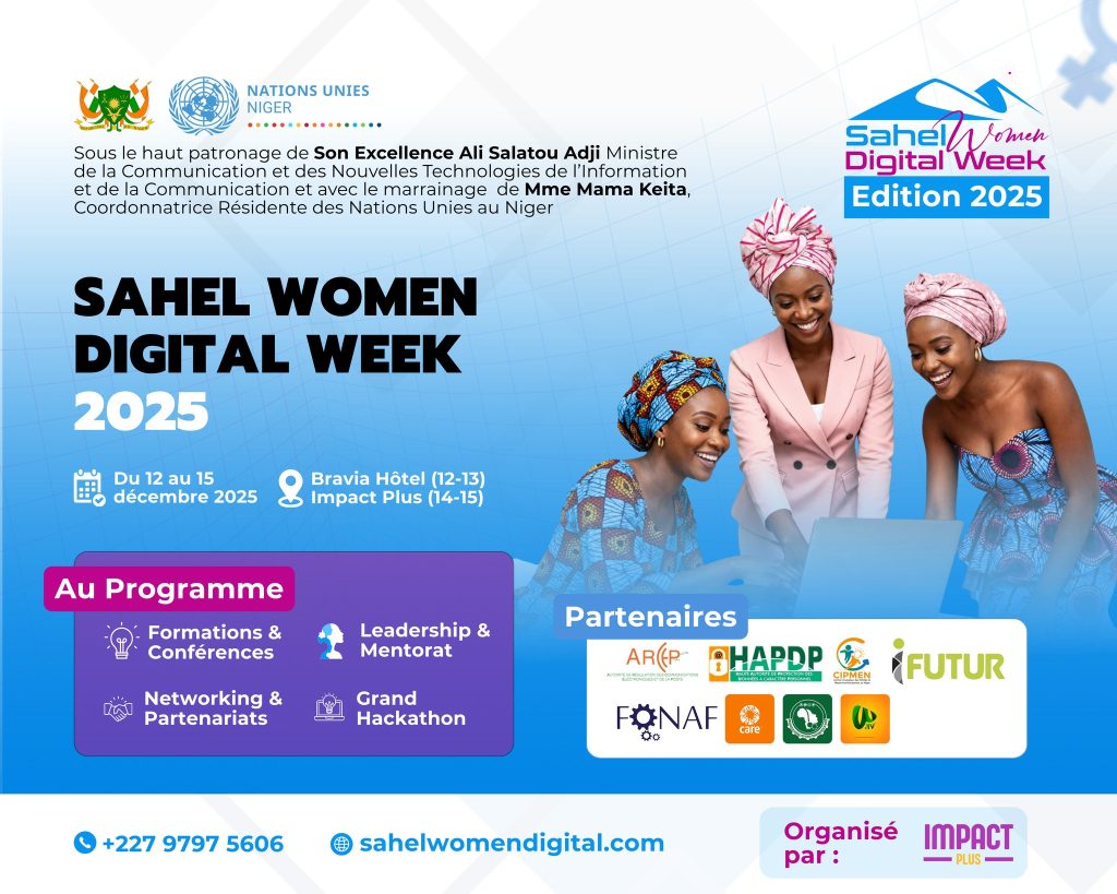 Sous le haut patronage de Son Excellence Ali Salatou Adji, Ministre de la Communication et des Nouvelles Technologies de l’Information et de la Communication, et avec le marrainage de Mme Mama Keita, Coordinatrice Résidente des Nations Unies au Niger, la Sahel Women Digital Week revient pour une édition ambitieuse et tournée vers l’avenir.