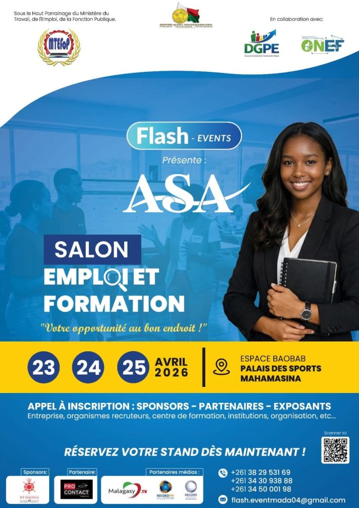 À l’occasion du Salon ASA – Emploi et Formation, qui se tiendra les 23, 24 et 25 avril 2026 au Palais des Sports Mahamasina, le Ministère du Travail, de l’Emploi et de la Fonction Publique invite les entreprises, organismes de formation et partenaires à saisir cette opportunité stratégique.