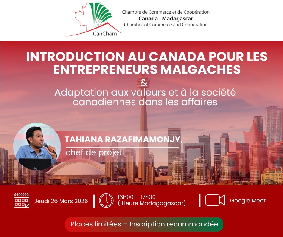 La Chambre de Commerce et de Coopération Canada-Madagascar (CanCham) lance son programme de formations stratégiques “DOING BUSINESS IN CANADA” pour soutenir l’ambition internationale de nos entrepreneurs.