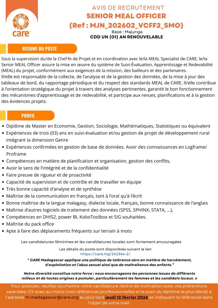 Comment postuler ? Envoyez votre dossier de candidature complet à l’adresse : rh.madagascar@care.org, incluant :