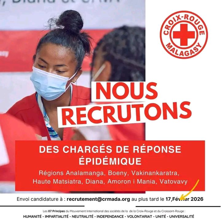La Croix-Rouge Malagasy (CRM) recrute 𝗦𝗘𝗣𝗧 (𝟬𝟳) 𝗖𝗵𝗮𝗿𝗴𝗲́(𝗲)𝘀 𝗱𝗲 𝗿𝗲́𝗽𝗼𝗻𝘀𝗲 𝗲́𝗽𝗶𝗱𝗲́𝗺𝗶𝗾𝘂𝗲 en 𝗖𝗗𝗗 𝗱𝗲 𝟰 𝗺𝗼𝗶𝘀.