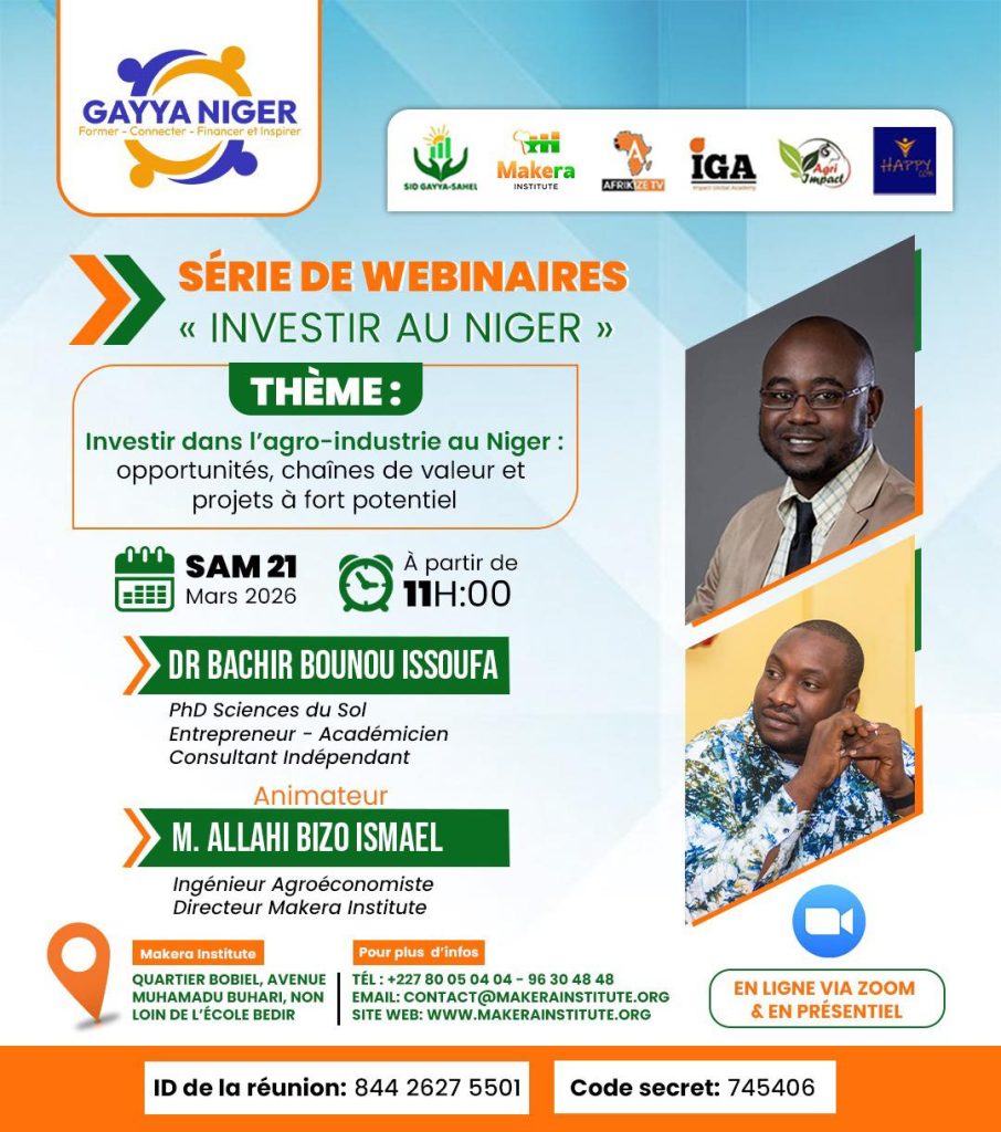 Dans le cadre de la série de webinaires « Investir au Niger » du programme Gayya Niger, nous vous invitons à prendre part à un échange consacré aux opportunités d’investissement dans le secteur agro-industriel.
