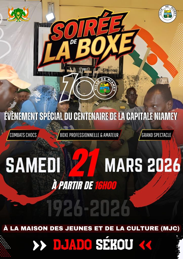 Dans le cadre des festivités marquant le centenaire de la capitale, la Ville de Niamey organise une soirée de boxe « Tournoi des ceintures », qui se tiendra le 21 mars 2026 à partir de 16h00 à la Maison des Jeunes et de la Culture (MJC).