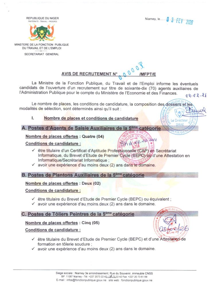 La Ministre de la Fonction Publique, du Travail et de l’Emploi informe les éventuels candidats de l’ouverture d’un recrutement sur titre de soixante-dix (70) agents auxiliaires de l’Administration Publique pour le compte du Ministère de l’Economie et des Finances.