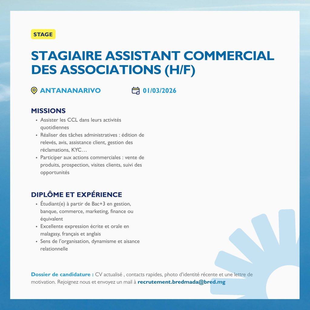 📩 Rejoignez-nous dès aujourd’hui en envoyant votre candidature à : recrutement.bredmada@bred.mg