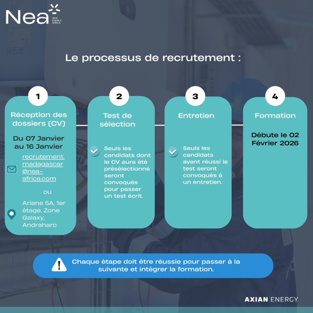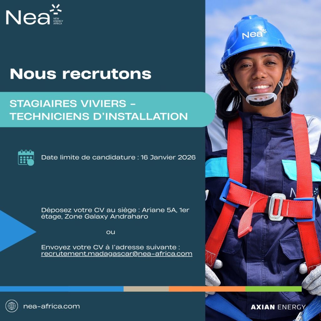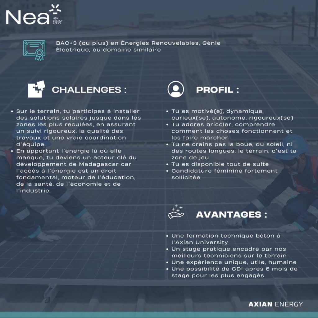 #NEA#Recrutement#Stage#StagiairesViviers#TechnicienInstallation#EnergieSolaire#AxianEnergy#Opportunité#Madagascar