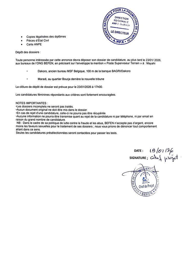 Date limite de dépôt des candidatures: Vendredi 23 Janvier 2026 à 17H00