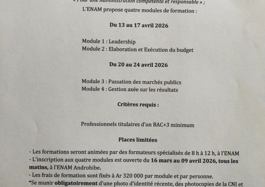 Date et Heure : Du 20 au 24 Avril 2026 de 8H00 à 12H00 Lieu : ENAM Androhibe, Antananarivo Prix : Frais : 320 000 Ar par module À propos de l’événement : 𝗙𝗼𝗿𝗺𝗮𝘁𝗶𝗼𝗻 𝗮̀ 𝗹’𝗘𝗡𝗔𝗠 – 𝗔𝘃𝗿𝗶𝗹 𝟮𝟬𝟮𝟲 L’École