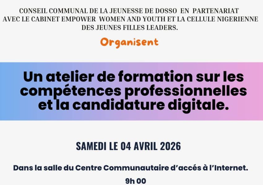 Date et Heure : Samedi 4 Avril 2026 à 9H00 Lieu : Salle du Centre Communautaire d’Accès à l’Internet, Niamey Prix : À propos de l’événement : OPPORTUNITÉ DE FORMATION À DOSSO L’antenne régionale de la CNJFL Dosso, en partenariat
