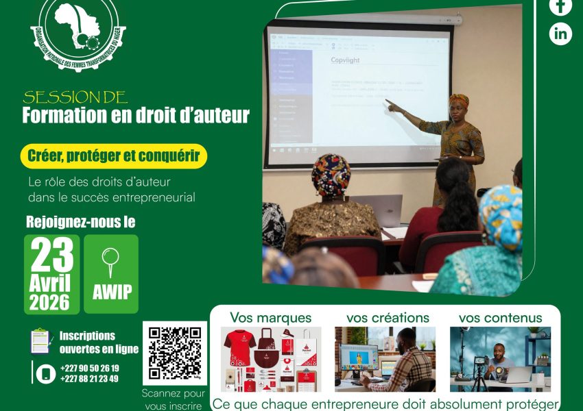 Date et Heure : Jeudi 23 Avril 2026 Lieu : AWIP, En Ligne, Niamey Prix : À propos de l’événement : 𝗦𝗲𝘀𝘀𝗶𝗼𝗻 𝗙𝗼𝗿𝗺𝗮𝘁𝗶𝗼𝗻 𝗲𝗻 𝗱𝗿𝗼𝗶𝘁 𝗱’𝗮𝘂𝘁𝗲𝘂𝗿 ! Créer, c’est bien. Protéger, c’est essentiel. Aujourd’hui, vos idées, vos créations et vos