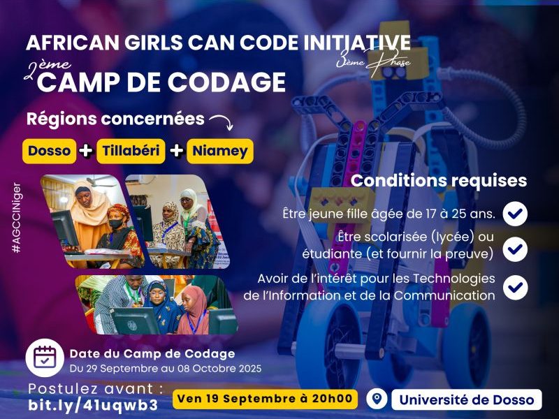 Date et Heure : Date limite : Vendredi 19 Septembre 2025. Lieu : Niamey, Dosso, Tillabéri Prix : Gratuit !!! À propos de l’événement : 🚀 Appel à Candidatures – 4ème Camp de Codage AGCCI Tu as entre 17 et
