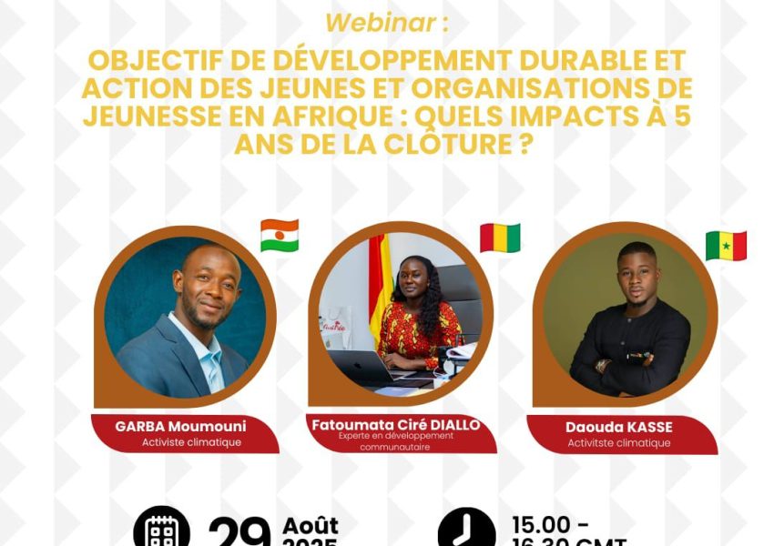 Date et Heure : Vendredi 29 Août 2025 de 15H00 – 16H30 GMT Lieu : En Ligne, Niamey Prix : Gratuit! À propos de l’événement : 🌍 Webinaire & Jeunesse & ODD en Afrique : Quels impacts à 5 ans