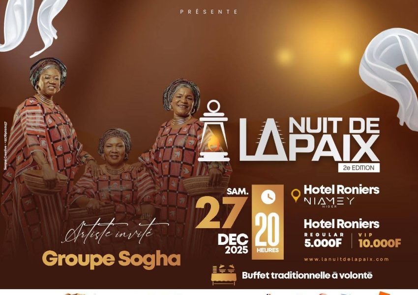 Date et Heure : Samedi 27 Décembre 2025 dès 20H00 Lieu : Hôtel Les Roniers, Niamey Prix : PRIX REGULIER : 5.000 FCFA PRIX VIP : 10.000 FCFA À propos de l’événement : BOOM | La Nuit de la Paix