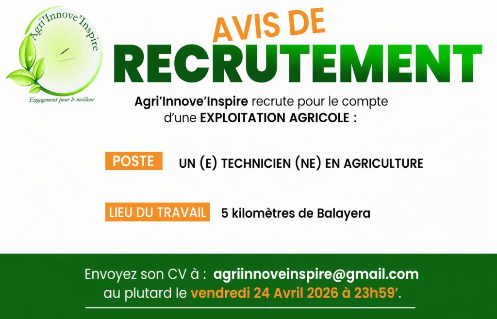 Les dossiers de candidature doivent être envoyés à l’adresse suivante : agriinnoveinspire@gmail.com, avec la mention « Candidature Technicien en Agriculture» en objet du courriel, au plus tard le 24 avril 2026 à 23h59.