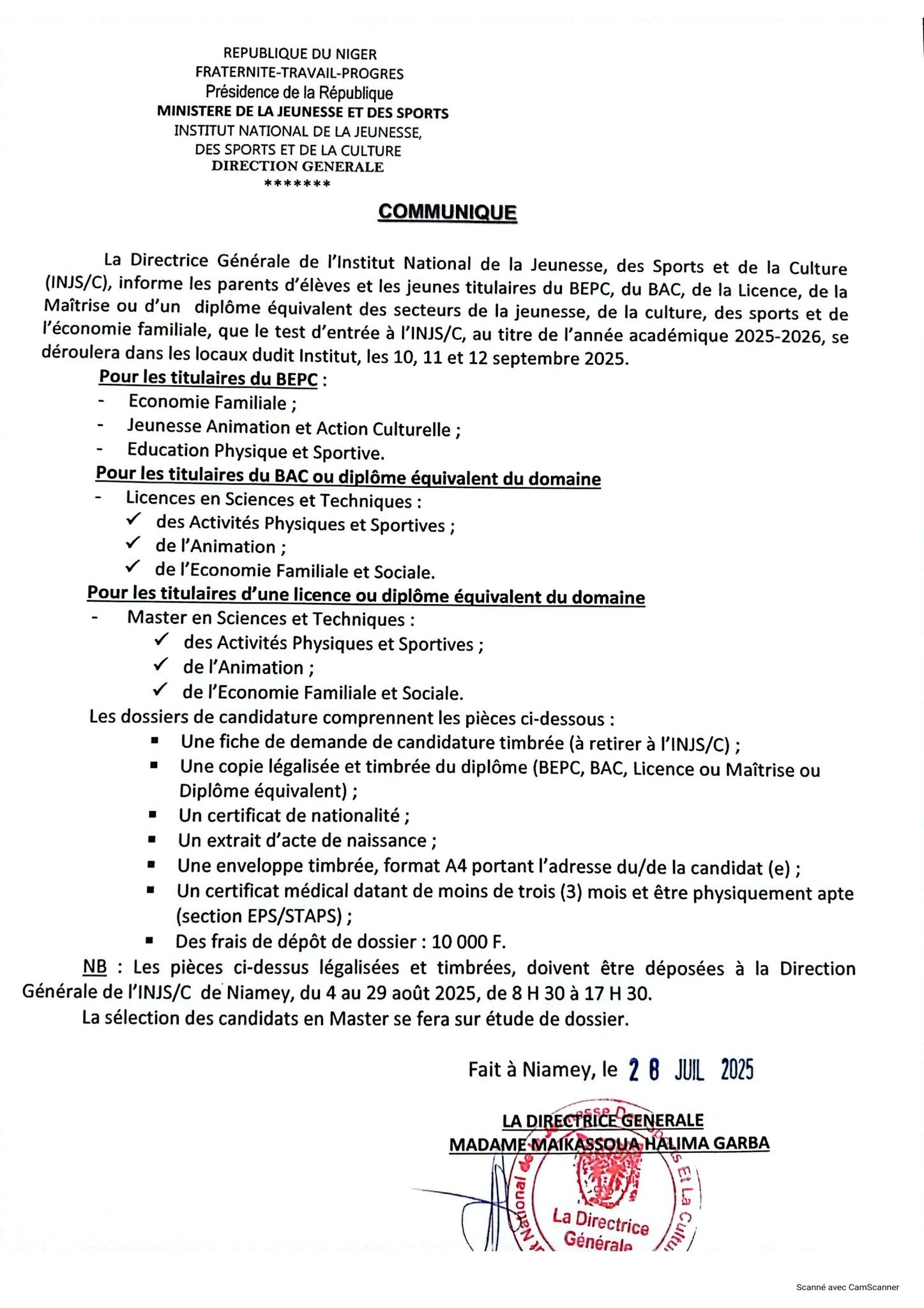 Date de Dépôt de Dossiers: Du 4 au 29 Août 2025 de 8H30 à 17H30