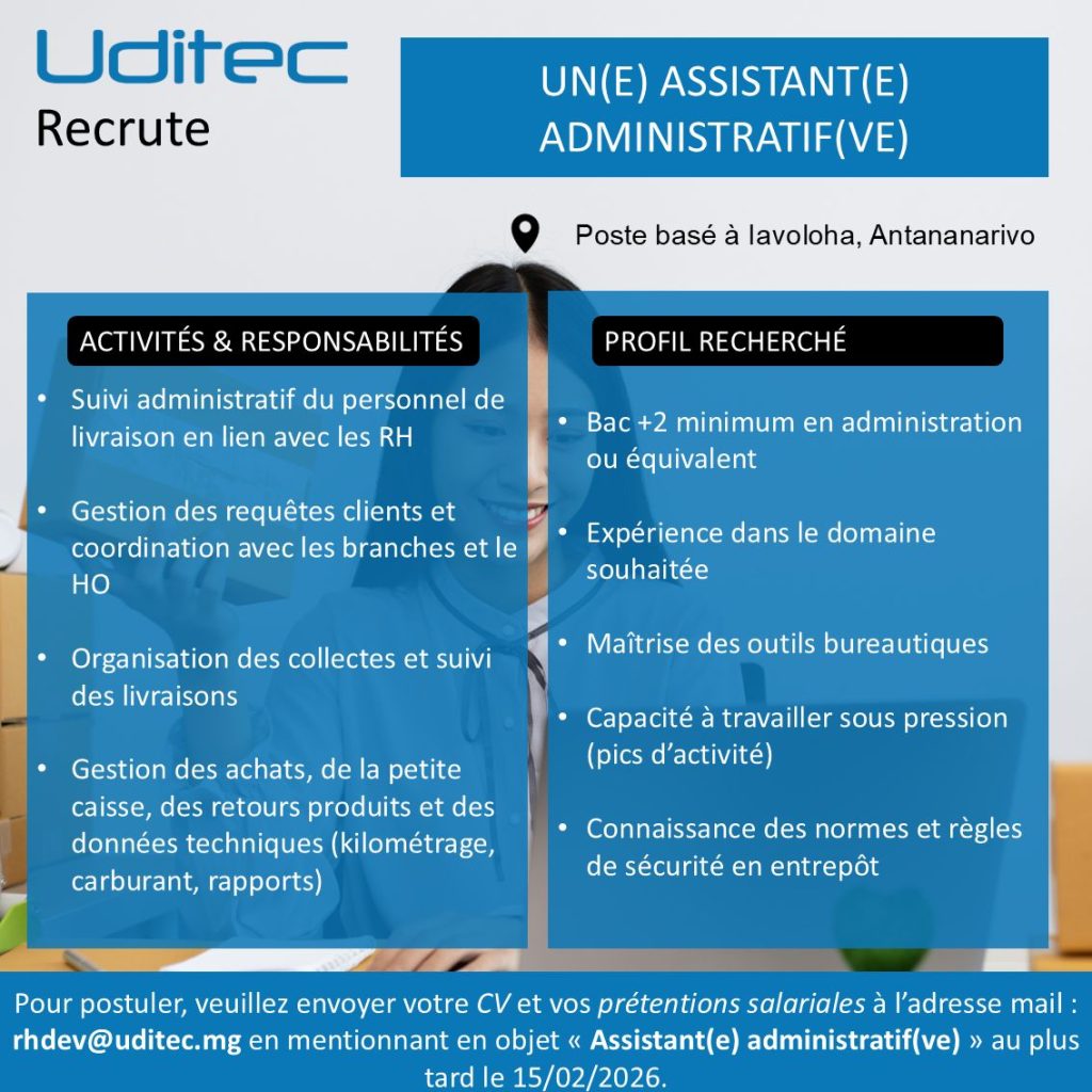 Envoyez votre CV à rhdev@uditec.mg avec le nom du poste en objet.