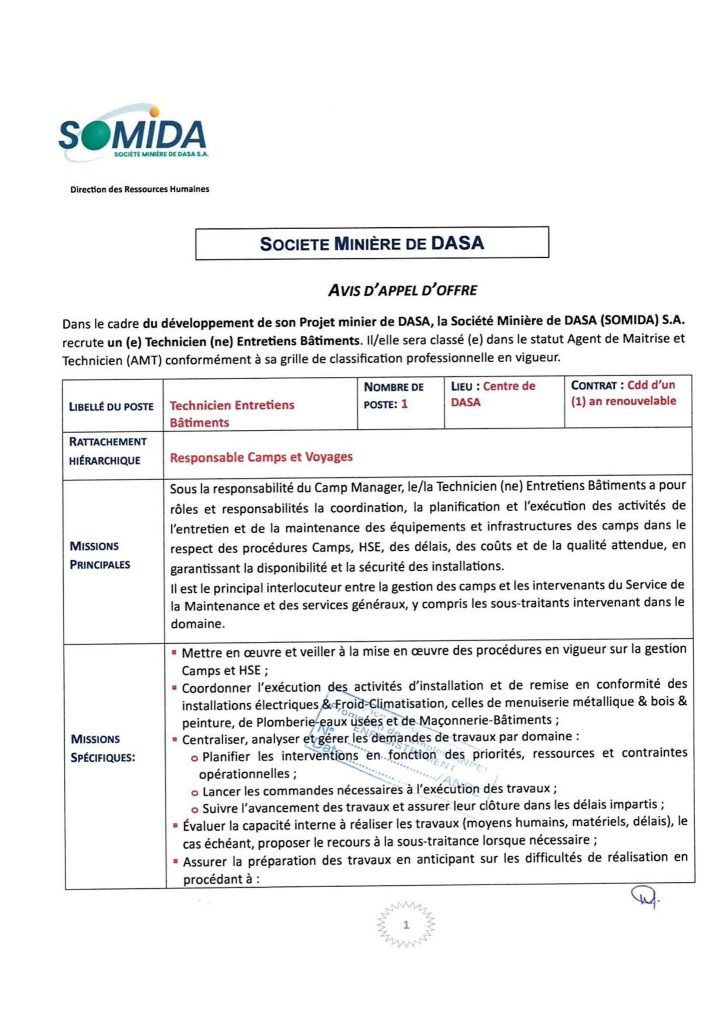SOMIDA S.A. Recrute un (e) Technicien (ne) Entretiens Bâtiments.