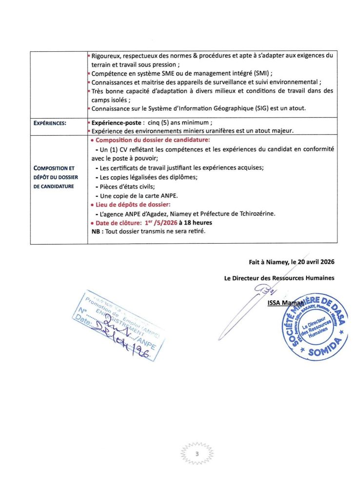 Date limite des dépôts de candidatures: Vendredi 1er Mai 2026 à 18H00