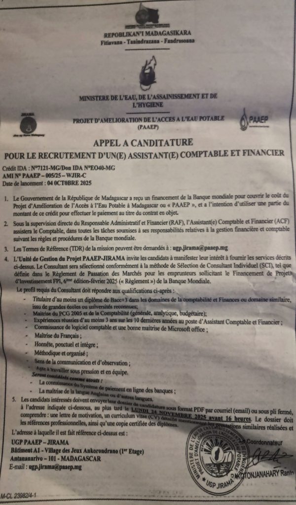 Date limite des dépôts de candidatures : Lundi 24 Novembre avant 16H00.