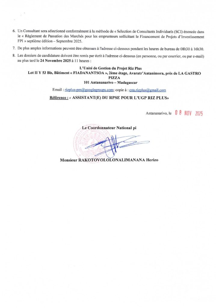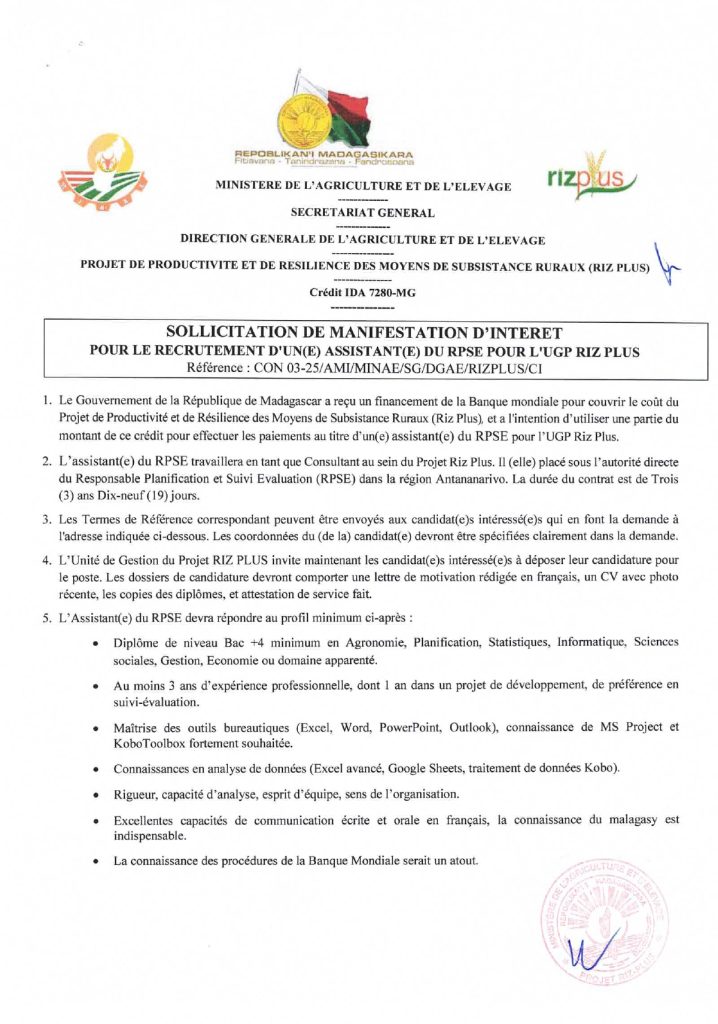 #AMI: Recrutement d’un(e) Assistant(e) du RPSE pour l’UGPR RIZ PLUS