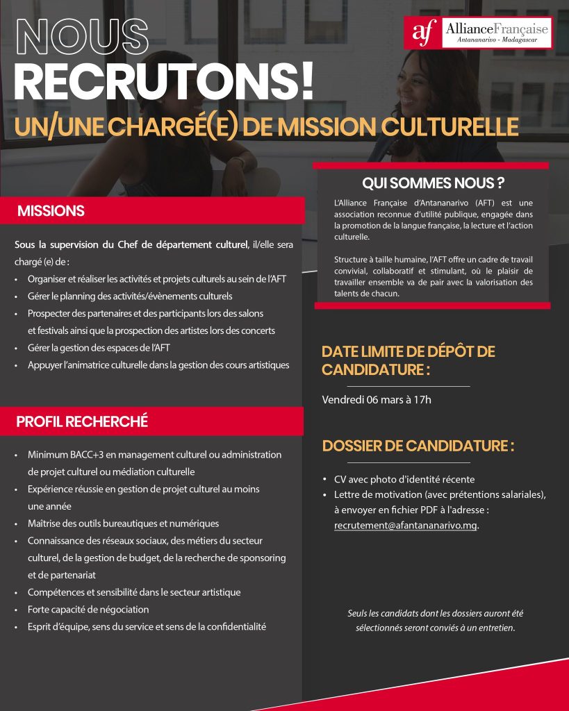 Envoie vite ta candidature à : recrutement@afantananarivo.mg