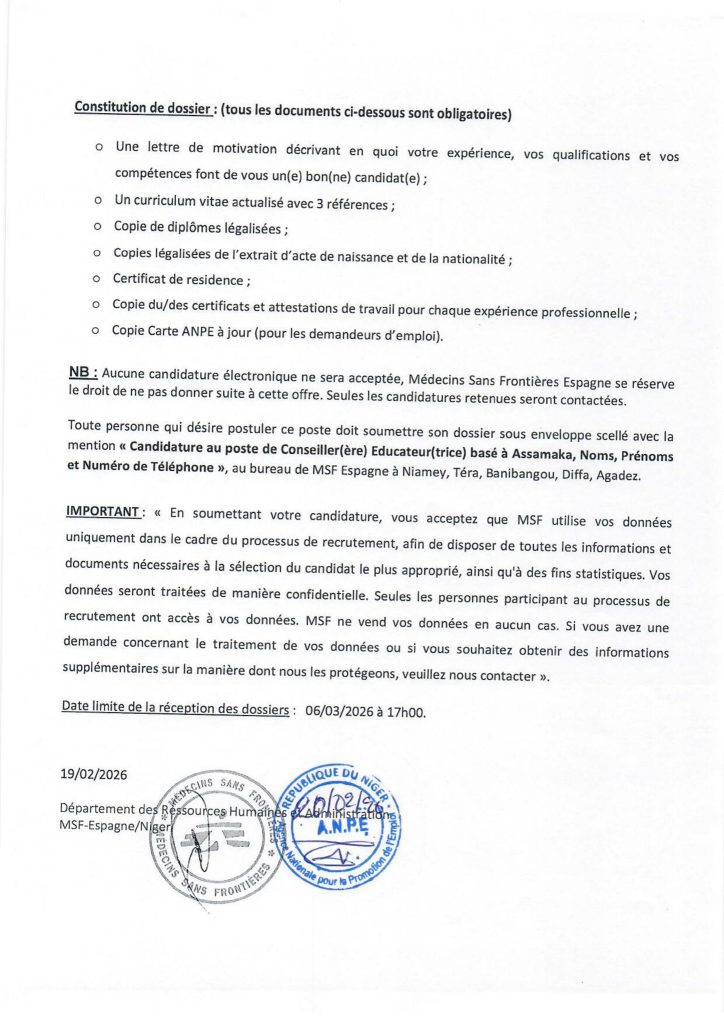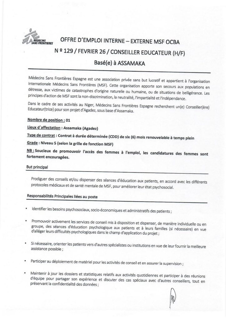 Médecins Sans Frontières Espagne recherchent un(e) #Conseiller(ère) #Educateur(trice) pour son projet d’Agadez, sous base d’Assamaka.