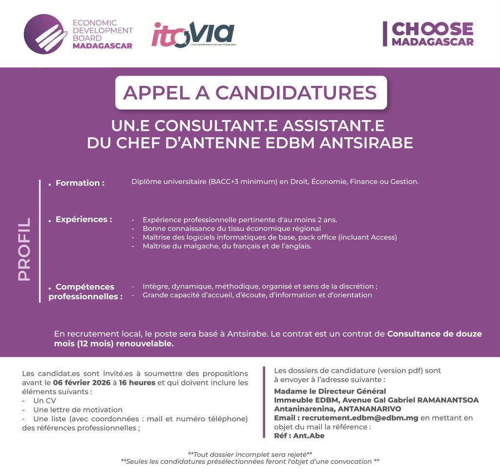 L’Economic Development Board of Madagascar (EDBM) est un Établissement Public à caractère Industriel et Commercial (EPIC). En tant qu’agence nationale de promotion des investissements, l’EDBM joue un rôle central au sein de l’écosystème économique malgache, en contribuant à la relance économique du pays à travers la mise en place d’un environnement favorable aux affaires, la facilitation et l’accompagnement des projets d’investissements, ainsi que la promotion des opportunités d’investissement à Madagascar.
